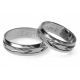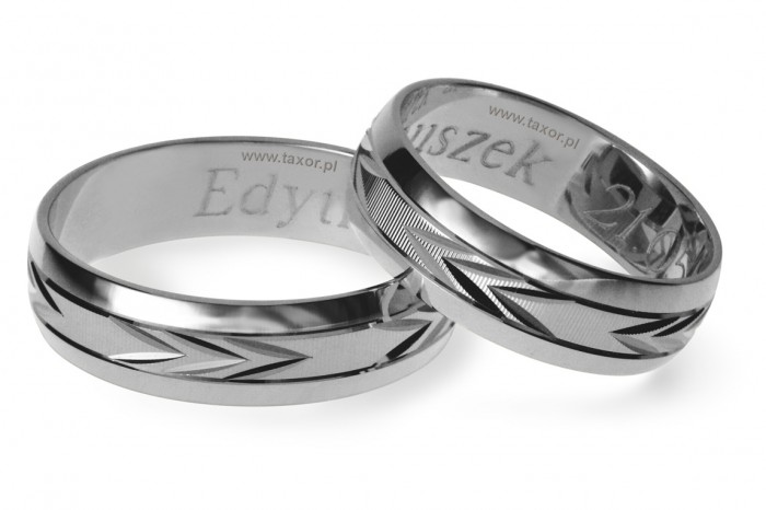Interesujące obrączki o szerokości 6 mm wykonane z białego złota w technologii bezszwowej. Na całym obwodzie nacięte są ozdobne rowki. Pomiędzy nacięciami można oprawić do 5 szt. kamieni.