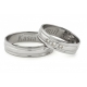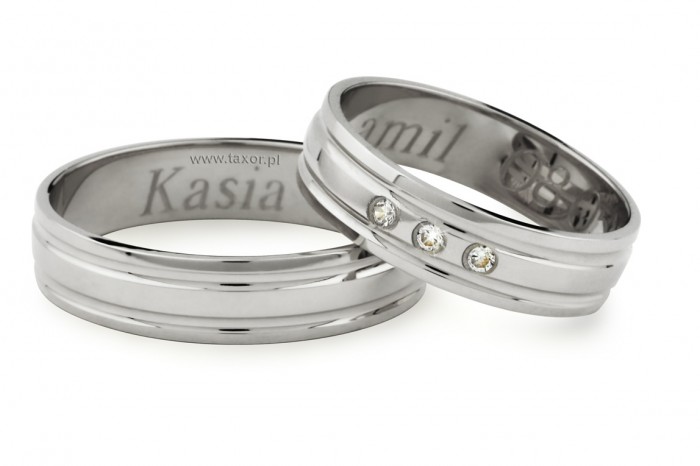 Jednokolorowe bardzo proste obrączki o szerokości 6 mm wykonane z białego złota w technologii bezszwowej. Na obwodzie nacięte są dwa ozdobne rowki. W obrączce damskiej można oprawić do 9 szt kamieni.