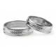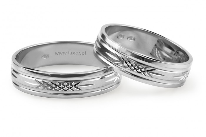 Proste, jednokolorowe obrączki o szerokości 5 mm z białego złota wykonane w technologii bezszwowej. Obrączka ozdobiona oryginalnym wzorem naciętym na całym obwodzie.