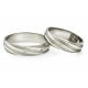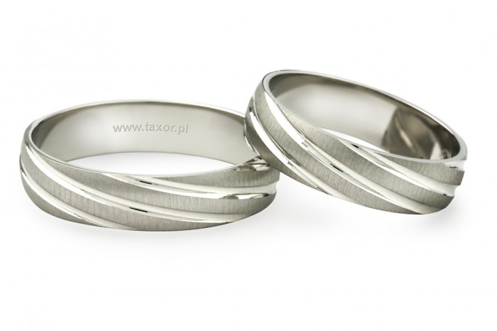 Obrączki z białego złota o szerokości 5 mm wykonane w technologii bezszwowej. Obrączki ozdobione naciętymi na skos dwoma wypolerowanymi rowkami.