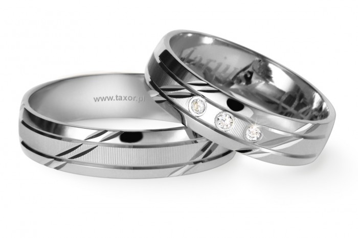 Bardzo ciekawe obrączki o szerokości 5 mm wykonane z białego złota w technologii bezszwowej. Na całym obwodzie nacięte są ozdobne rowki. Pomiędzy nacięciami można oprawić do 5 szt. kamieni.
