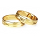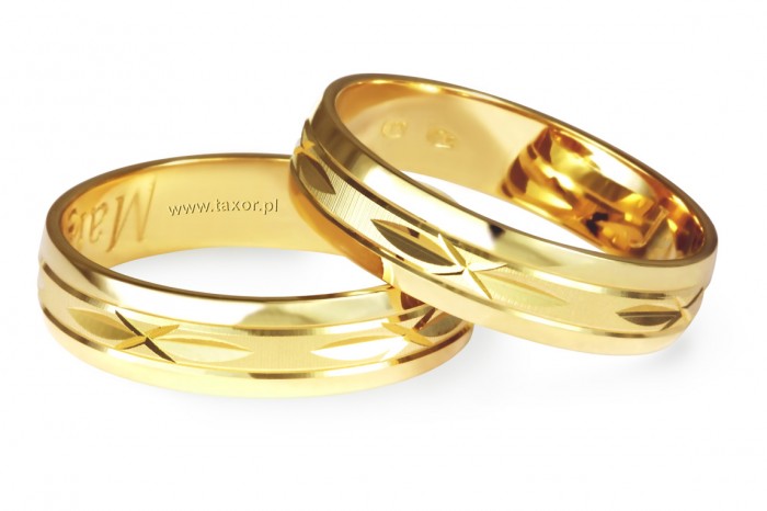 Obrączki z żółtego złota o szerokości 5 mm wykonane w technologii bezszwowej. Obrączka ozdobiona oryginalnym wzorem naciętym na matowej powierzchni środkowego pierścienia.