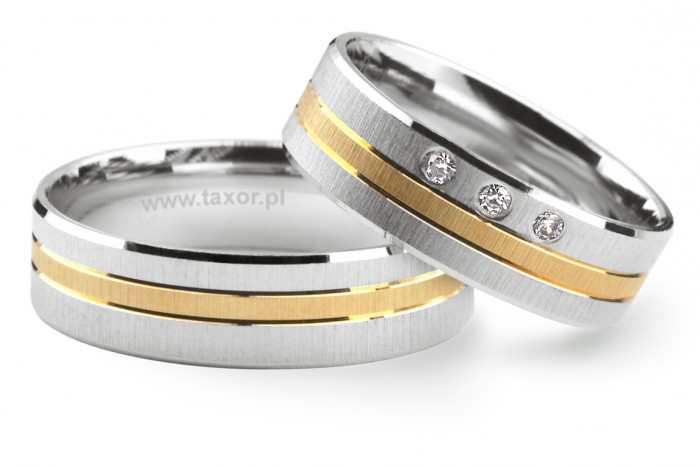 Eleganckie obrączki dwukolorowe w wersji matowanej wykonane z białego i żółtego złota w technologii bezszwowej. Niesymetrycznie oprawione kamienie przy krawędzi oraz nierówne szerokości pierścieni czynią ten wzór bardzo oryginalnym i dodają obrączkom niezwykłego uroku.