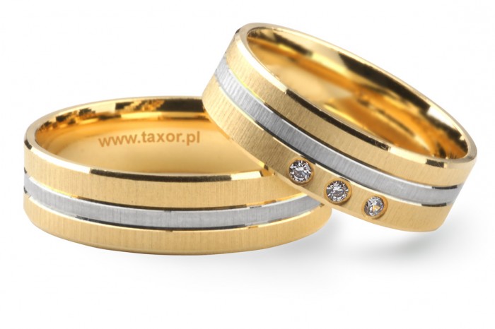 Eleganckie obrączki dwukolorowe w wersji matowanej wykonane z białego i żółtego złota w technologii bezszwowej. Niesymetrycznie oprawione kamienie przy jednej z krawędzi oraz nierówne szerokości kolorowych pierścienina czynią ten wzór bardzo oryginalnym i dodają obrączkom niezwykłego uroku.