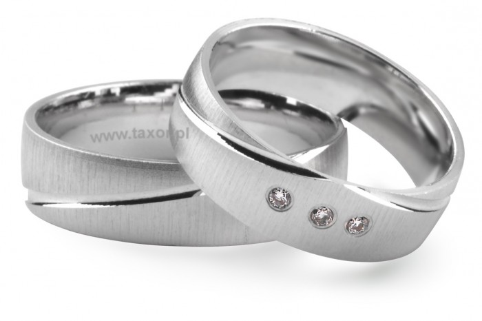 Eleganckie obrączki wykonane z białego złota w technologii bezszwowej. Nacięty skośnie, wypolerowany rowek odcina się wyraźnie od matowanej powierzchni i dodaje szczególnego uroku tym obrączkom.