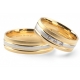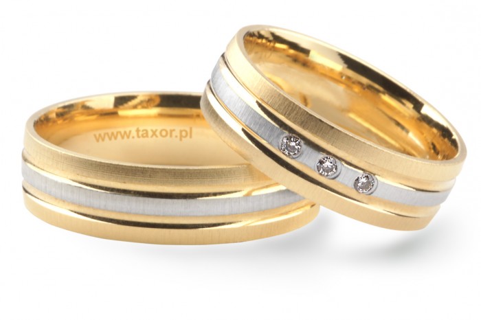 Eleganckie obrączki dwukolorowe w wersji matowanej wykonane z białego i żółtego złota w technologii bezszwowej. Polerowane rowki odcinają się wyraźnie od matowionej lekko wypukłej powierzchni obrączek. W środkowym pierścieniu obrączki damskiej można oprawić kamienie.