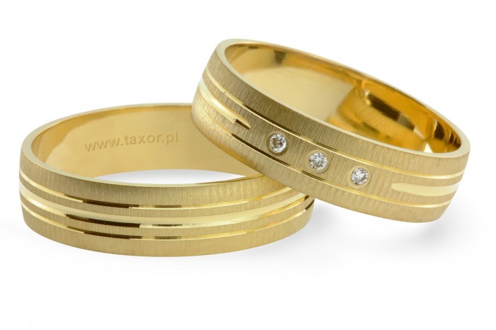 Ponadczasowe, jednokolorowe obrączki o szerokości 5 mm wykonane z żółtego złota w technologii bezszwowej. Powierzchnia matowa, na której nacięte są na obwodzie trzy wypolerowane rowki. W obrączce damskiej można oprawić do 9 szt kamieni.