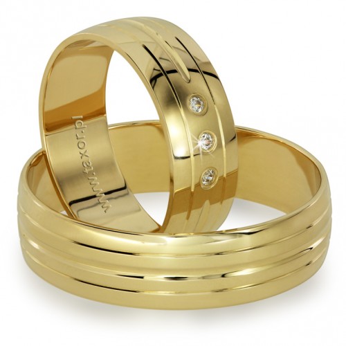 Obrączki ślubne firmy Zirkon wzór R-21 wykonane z żółtego złota w technologii bezszwowej. Obrączki ozdobione delikatnymi rowkami na całym obwodzie wyglądają interesująco.
