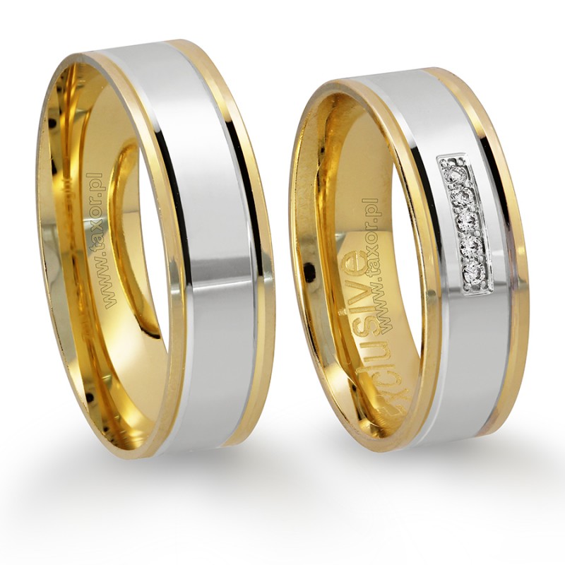 Obrączki ślubne X-13 o szerokości 6 mm zaprezentowane na zdjęciu są wykonane z połączonych ze sobą pierścieni z żółtego i białego złota. Połączenie metodą sinteringu jest bardzo trwałe i pozbawione przebarwień w miejscu łączenia. Ten wzór wygląda najkorzystniej z pierścieniem z białego złota centralnie na środku, ale oczywiście kolory można odwrócić. Można też zamiast żółtego użyć różowego złota. W obrączce damskiej w pierścieniu z biało złota producent proponuje oprawę pięciu kamieni: cyrkonii lub diamentów o średnicy 1.25 mm. Brylanty mają czystość SI i barwę H.