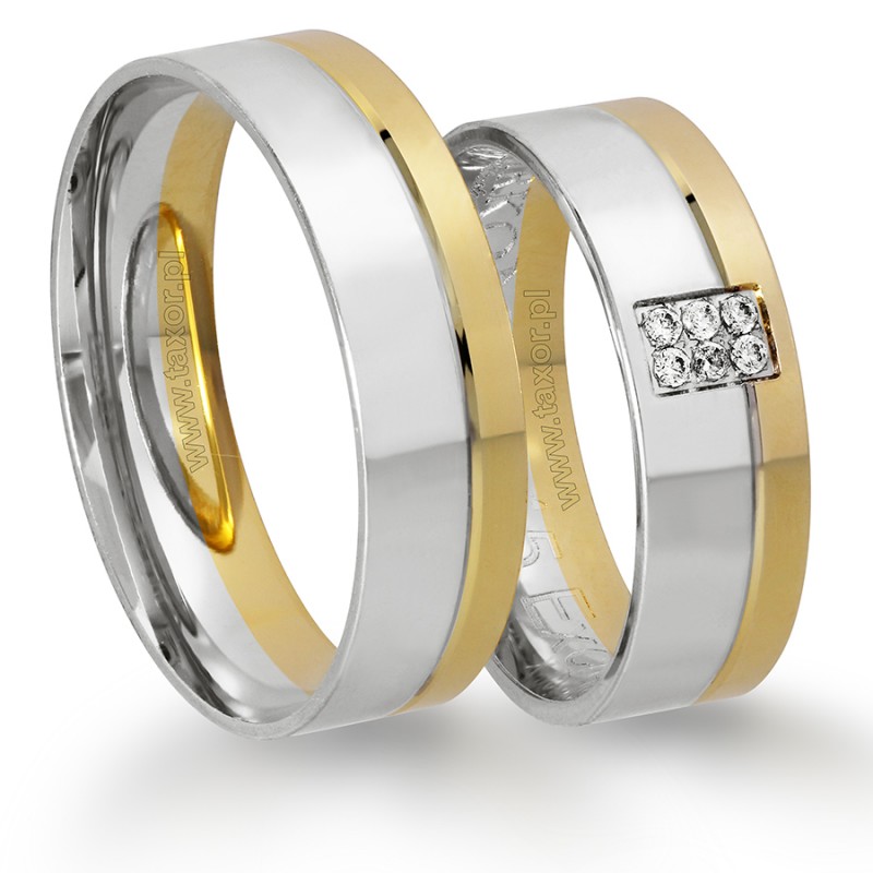 Obrączki ślubne X-15 o szerokości 6 mm zaprezentowane na zdjęciu są wykonane z połączonych trwale ze sobą dwóch pierścieni z żółtego i białego złota. Zewnętrzna strona obrączki jest płaska. Taka biżuteria - prosta i ponadczasowa cieszy się największym powodzeniem. Pierścień z białego złota jest szerszy, ale można kolory zamienić lub użyć zamiast żółtego różowego złota. Różne kolory złota są oddzielone od siebie delikatnym nacięciem. Białe złoto na życzenie klienta pokrywamy galwanicznie rodem. Zabieg ten ma na celu poprawę estetyki i zwiększenie kontrastu pomiędzy złotem o różnych kolorach.