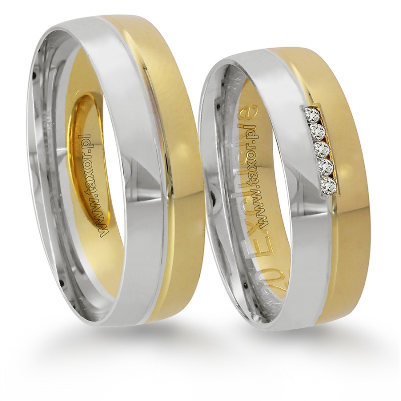 Obrączki ślubne X-20 o półokrągłym profilu i  szerokości 6 mm zaprezentowane na zdjęciu są wykonane z dwóch pierścieni z żółtego i białego złota o jednakowej szerokości połączonych trwale ze sobą. Połączenie metodą sinteringu jest bardzo wytrzymałe i pozbawione przebarwień w miejscu łączenia. W obrączce damskiej w pierścieniu z biało złota producent proponuje oprawę pięciu kamieni: cyrkonii lub diamentów o średnicy 1.25 mm. Brylanty mają czystość SI i barwę H. Na środku wytoczony jest półokrągły rowek oddzielający od siebie dwa pierścienie o różnych kolorach. Zamiast złota w kolorze żółtym można użyć różowego złota. Białe złoto korzystnie jest dodatkowo pokryć galwanicznie rodem. Taka biżuteria jest jaśniejsza i bielsza i lepiej widoczny jest kontrast pomiędzy żółtym i białym złotem. Dla klientów ceniących większy komfort proponujemy wersję z wyobleniem wewnątrz. Warto wybrać opcję z soczewką, bo taka obrączka jest znacznie wygodniejsza w noszeniu.