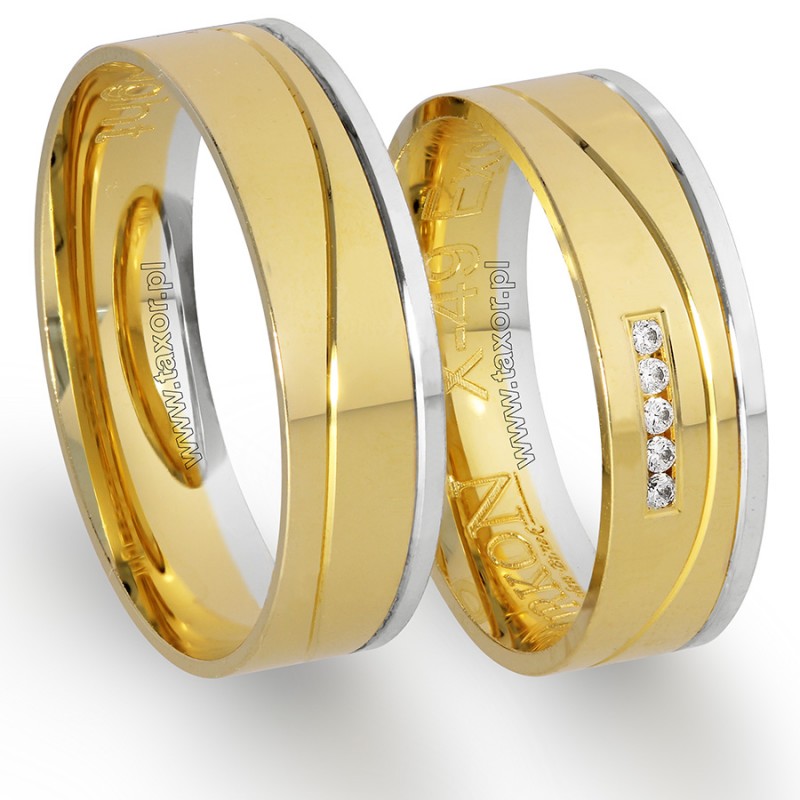 Obrączki ślubne X-49 o szerokości 6 mm zaprezentowane na zdjęciu są wykonane z połączonych trwale ze sobą dwóch pierścieni z żółtego i białego złota. Zewnętrzna strona obrączki jest płaska. Takie wzornictwo - proste i ponadczasowe cieszy się największym powodzeniem. Najkorzystniej ten wzór wygląda z węższym pierścieniem z białego złota, ale kolory można na życzenie odwrócić. Można również użyć złota w kolorze różowym. Różne kolory złota są oddzielone od siebie rowkiem wytoczonym na obwodzie. Dodatkowo żółty pierścień ozdobiony jest rowkiem w kształcie falistej linii. Obrączka damska jest ozdobiona pięcioma kamieniami: diamentami lub cyrkoniami o średnicy 1.25 mm.