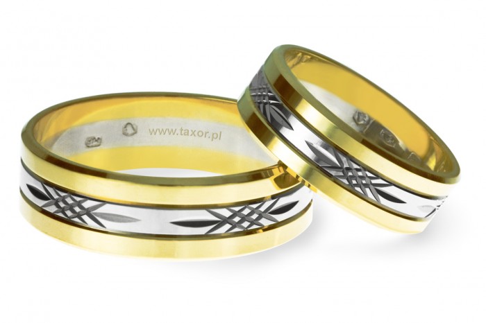 Ponadczasowe, proste i jednocześnie bardzo eleganckie obrączki o szerokości 6 mm wykonane z białego i żółtego złota w technologii bezszwowej. Na środkowym pierścieniu ozdobne nacięcia. To jeden ze wzorów, który niezmiennie cieszy się dużym powodzeniem. Powierzchnia polerowana. W tym wzorze nie przewidujemy oprawy kamieni.