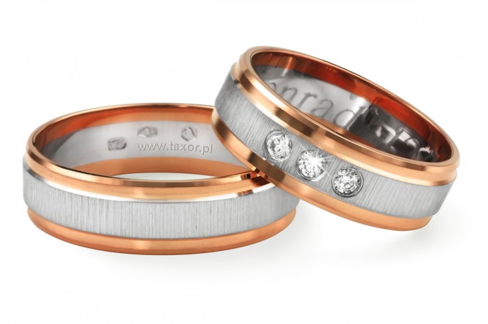Proste i bardzo eleganckie obrączki o szerokości 6 mm wykonane z białego i żółtego złota w technologii bezszwowej. Ten wzór od wielu lat cieszy się dużym powodzeniem. Środkowy pierścień matowy. W obrączce damskiej można oprawić do 9 szt. kamieni.