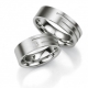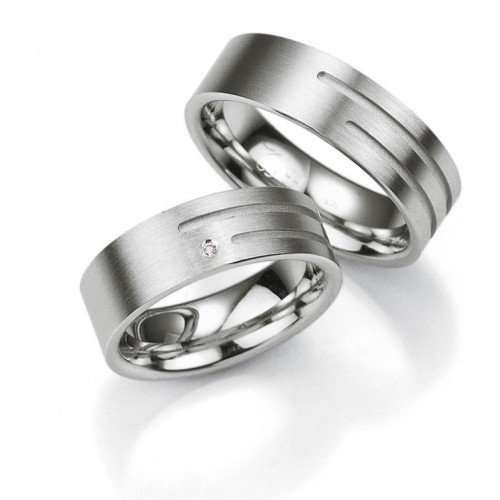 Delikatne frezowane rowki na płaskiej powierzchni zewnętrznej obrączek wyglądają intrygująco i nadzwyczaj ciekawie. Powierzchnia pokryta galwanicznie platyną jest lekko matowana. W takim wykonaniu platynowane obrączki srebrne wyglądają najkorzystniej. Dla poprawy komfortu noszenia producent wyprofilował wewnętrzną powierzchnię w kształcie soczewki. Taki kształt zapewnia doskonałe dopasowanie obrączki do palca i dobry dopływ powietrza pod obrączkę. Wyoblenie ma największe znaczenie w przypadku obrączek szerokich, a z takimi mamy tu do czynienia. Damską obrączkę można dodatkowo ozdobić niewielkim brylantem umieszczony niesymetrycznie na przedłużeniu jednego z rowków. Podobnie jak złote obrączki Breuning obrączki srebrne są produkowane metodę bezszwową, która zapewnia im niezwykłą wytrzymałość, trwałość i idealny kształt.