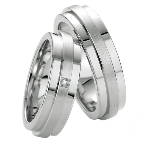 Obrączki Breuning wykonane ze srebra próby 925, pokryte galwanicznie platyną, o oryginalnym kształcie z wypukłym matowym pierścieniem na środku. Powierzchnie boczne po obu stronach są polerowane, co kontrastuje wyraźnie z matową częścią obrączki. Pomimo, że dość masywne są wygodne w noszeniu ze względu na soczewkowy ergonomiczny kształt od strony wewnętrznej. Wyoblenie znacznie poprawia komfort noszenia obrączki między innymi przez umożliwienie dopływu powietrza. Zapobiega to poceniu się palca, co często się zdarza przy obrączkach o większych szerokościach. Tak jak wszystkie pozostałe obrączki Breunig również te są wykonane w technologii bezszwowej. Nienaganny kształt, najwyższa wytrzymałość i doskonale wykończona powierzchni - to zalety tej metody produkcji obrączek. Klient ma do wyboru pięć krojów pisma do wykonania graweru wewnątrz obrączki. Wskazane jest oby długość napisu nie przekraczała 25 znaków. W obrączce damskiej producent przewidział możliwość oprawy wysokiej klasy brylantu o masie 0.015 ct.