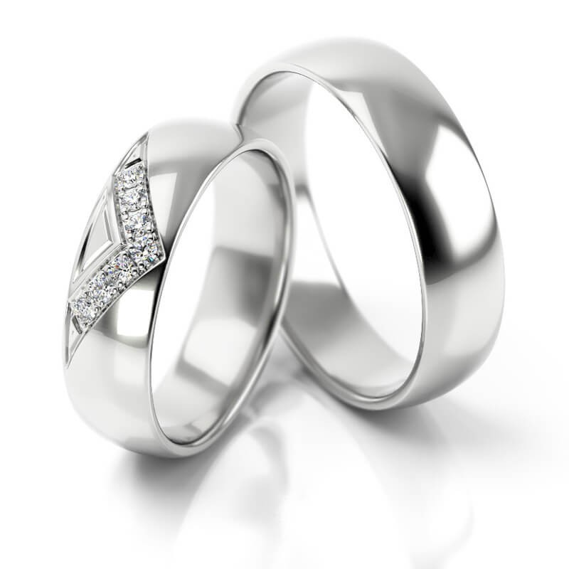 Obrączki o klasycznym półokrągłym profilu o szerokości 5 mm wykonane z białego złota z ciekawą oprawą 7 szt kamieni o średnicy 1.5 mm każdy.