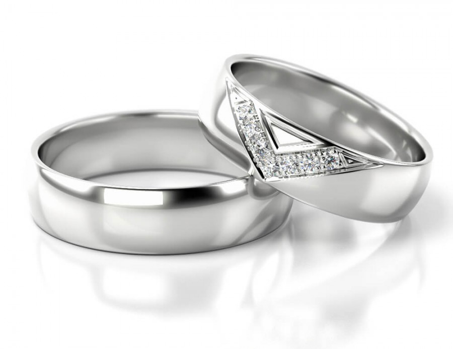 Obrączki o klasycznym półokrągłym profilu o szerokości 5 mm wykonane z białego złota z ciekawą oprawą 7 szt kamieni o średnicy 1.5 mm każdy.