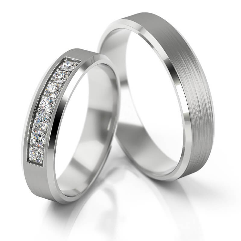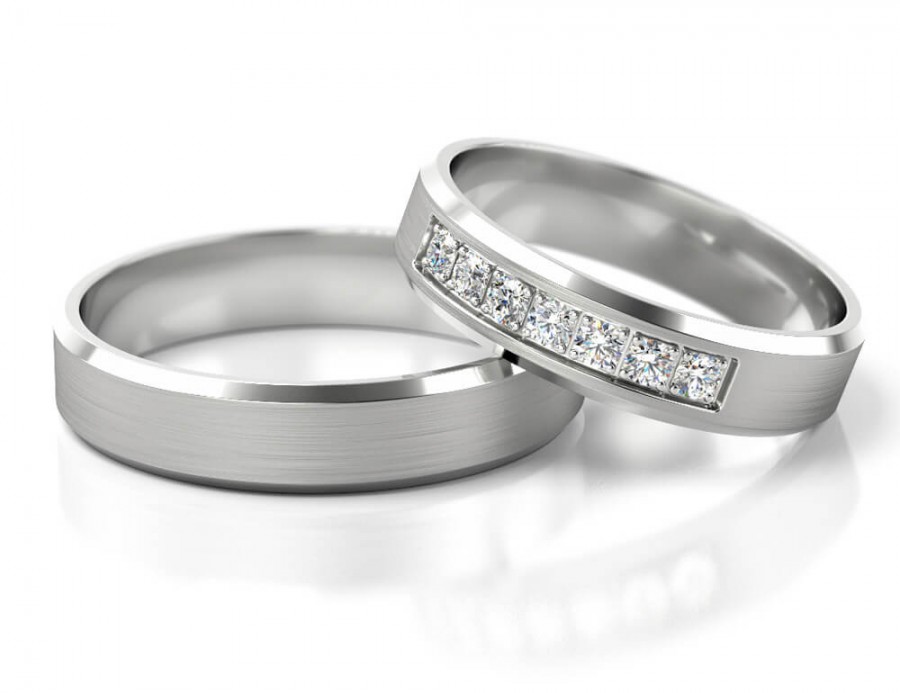 Obrączki o klasycznym płaskim profilu z fazowanymi krawędziami o szerokości 5 mm wykonane z białego złota z ciekawą oprawą 7 szt kamieni o średnicy 1.5 mm każdy.