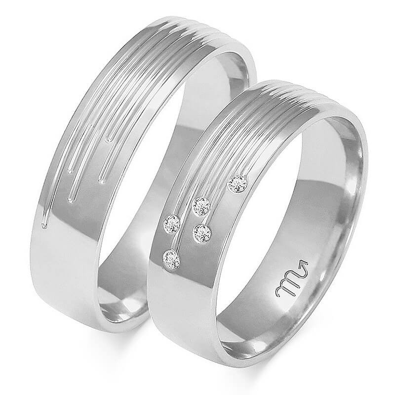 Obrączki ślubne o płaskim profilu ze zdobieniem w postaci frezowanych rowków cieszą się dużym powodzeniem. Efektowne zdobienie w postaci fantazyjnie naciętych rowków oraz cyrkonie lub brylanty oprawione w obrączce damskiej dodatkowo uatrakcyjniają ten wzór. Biżuterię z białego złota oferujemy wyłącznie w próbie 585 (14 karat). Bardziej wymagającym klientom proponujemy wersję z białego złota palladowego. Ten stop zalecany jest w szczególności dla alergików, gdyż nie zawiera w swym składzie niklu. Dla poprawienia wyglądu i uzyskania pięknego białego koloru biżuterię można porodować - czyli pokryć galwanicznie rodem - szlachetnym metalem dwukrotnie droższym od złota.