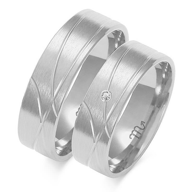 Obrączki ślubne o płaskim profilu cieszą się dużym powodzeniem. Efektowne zdobienie w postaci fantazyjnie naciętych rowków oraz cyrkonie lub brylanty oprawione w obrączce damskiej dodatkowo uatrakcyjniają ten wzór. Biżuterię z białego złota oferujemy wyłącznie w próbie 585 (14 karat). Bardziej wymagającym klientom proponujemy wersję z białego złota palladowego. Ten stop zalecany jest w szczególności dla alergików, gdyż nie zawiera w swym składzie niklu. Dla poprawienia wyglądu i uzyskania nienagannej bieli wyroby z białego złota dodatkowo pokrywa się warstwą rodu - szlachetnego metalu z grupy platynowców.
