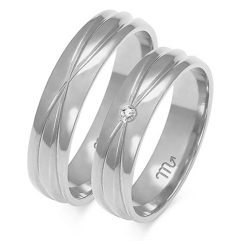 Obrączki ślubne półokrągłe z efektownym zdobieniem w postaci naciętych na powierzchni rowków. W modelu damskim producent proponuje oprawę cyrkonii lub brylantu.