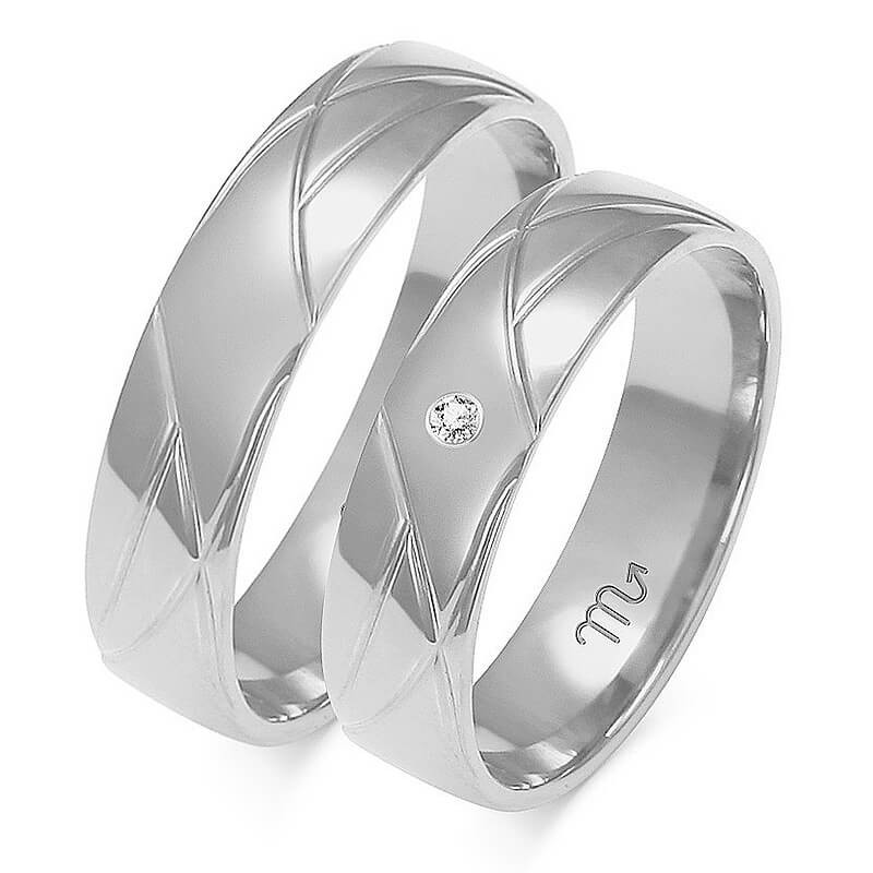Obrączki ślubne półokrągłe z efektownym zdobieniem w postaci naciętych na powierzchni rowków. W modelu damskim producent proponuje oprawę cyrkonii lub brylantu o czystości SI i barwie H.