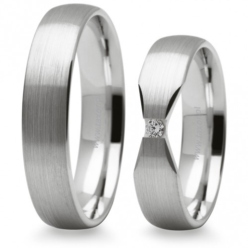Złote obrączki ślubne z białego złota firmy Stelmach wzór 263 wykonane w technologii bezszwowej. Ten oryginalny wzór cieszy się niesłabnącym powodzeniem. Na uwagę zasługuje oprawa kamienia o średnicy 2 mm. W standardzie powierzchnia jest matowana (M3), ale można użyć innego matu lub obrączki wypolerować na połysk.