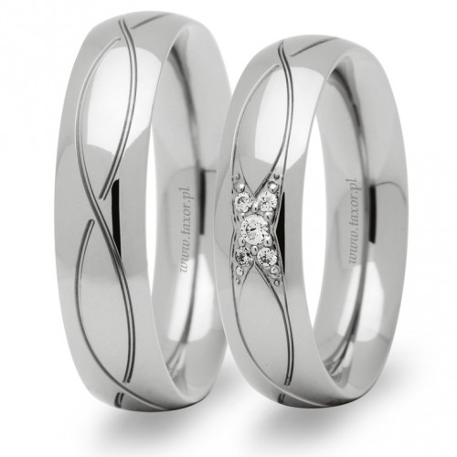 Standardowa szerokość obrączek wynosi 5 mm i producent nie przewiduje w przypadku tego wzoru innych szerokości. Na szczególną uwagę zasługuje w tym modelu oryginalna oprawa kamieni. Można oprawić zarówno cyrkonie jak i diamenty. Używany brylantów o czystości SI i barwie H. Centralny kamień ma masę 0.02 ct a cztery mniejsze po 0.01 ct. Jakość kamieni potwierdzona jest certyfikatem. Obrączki można zamówić również w kolorze żółtym lub różowym.