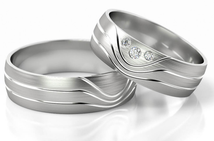 Niezwykle oryginalne obrączki ślubne produkcji  PZ Stelmach. Jest to jeden z piękniejszych wzorów z najnowszej kolekcji z bardzo ciekawym zdobieniem za pomocą naciętych niesymetrycznie rowków na zewnętrznej powierzchni obrączki. W obrączce damskiej dopełnieniem zdobień są pięknie oprawione trzy cyrkonie o średnicy 1.7 mm i 1.2 mm.