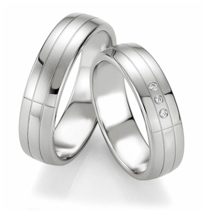 Piękne, ponadczasowe klasyczne obrączki wykonane z palladu - wzór 2625 Breuning z delikatnie naciętymi ozdobnymi rowkami. Obrączki są dość masywne a ich szerokość wynosi 6 mm. Nacięcia oddzielają powierzchnie matowane od polerowanych. W damskiej zaprezentowane oprawę trzech brylantów W,Si o łącznej masie 0.03 ct, ale można na życzenie klienta oprawić więcej lub mniej kamieni. Soczewkowy profil od strony wewnętrznej jest starannie dobrany tak, że obrączki praktycznie nie czuje się jej na palcu. Dostępna jest próba palladu 500 i 950. Zdecydowanie polecamy tę wyższą próbę. Obrączki z palladu w próbie 950 prezentuję się korzystniej, powierzchnia jest śnieżno biała a wysoka zawartość palladu w stopie zapewnia większą odporność na czynniki chemiczne i mechaniczne.