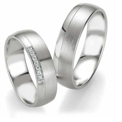 Obrączki ślubne wykonane z palladu o klasycznym kształcie ozdobione wytoczonym niesymetrycznie delikatnym rowkiem oddzielającym część polerowaną od matowanej. Diamenty w obrączce damskiej oprawione są niesymetrycznie przy jednej krawędzi. Na zdjęciu zaprezentowano oprawę 7 sztuk brylantów W/Si o łącznej masie 0.053 ct..Ten wzór oznaczony jest nr 2629, Obrączki mają szerokość 6 mm. i wykonane są z doskonałej jakości stopu palladu. Są niezwykle wygodne w noszeniu. Wyoblenie wewnętrznej powierzchni zapewnia dobry dopływ powietrza pod obrączkę i zapobiega poceniu się palca. Soczewkowy profil jest tak perfekcyjnie dobrany, że obrączki praktycznie nie czuje się jej na palcu. Dostępna jest próba palladu 500 i 950. Zdecydowanie polecamy tę wyższą próbę. Obrączki z palladu w próbie 950 prezentuję się korzystniej, powierzchnia jest śnieżno biała a wysoka zawartość palladu w stopie zapewnia większą odporność na czynniki chemiczne i mechaniczne.