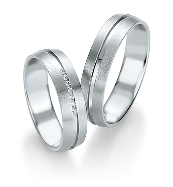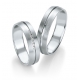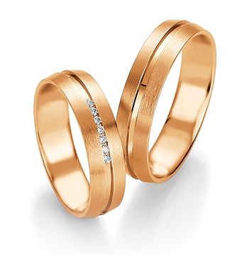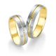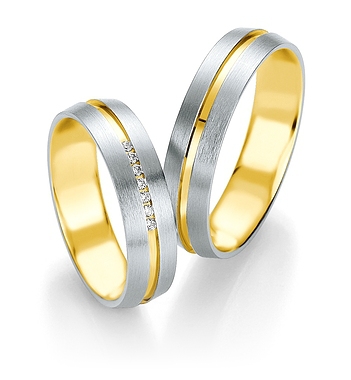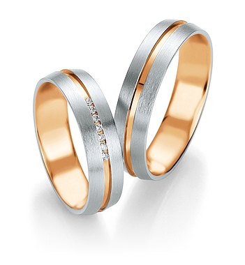 Ekskluzywne dwukolorowe obrączki Breuning wykonane w technologii bezszwowej. Obrączka damska jest ozdobiona brylantami umieszczonymi w naciętym na środku rowku.