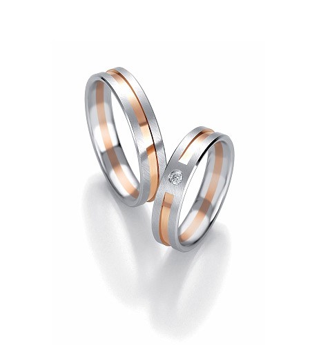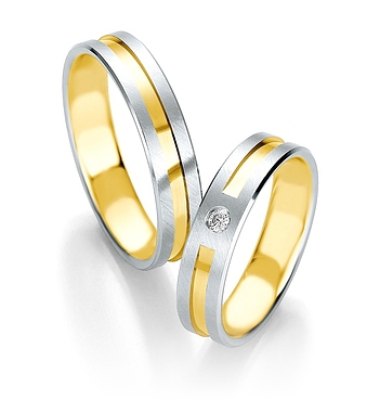 Ekskluzywne dwukolorowe obrączki Breuning wykonane w technologii bezszwowej. Na środku wytoczono prosty rowek. W damskiej obrączce oprawiony pojedyńczy brylant.