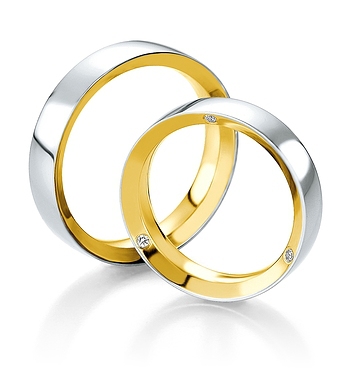 Ten dwukolorowy wzór o szerokości 5 mm z żółtego lub różowego złota z zewnętrznym pierścieniem z białego złota wygląda nadzwyczaj pięknie. Na uwagę zasługuje bardzo nietypowa i intrygująca oprawa trzech brylantów o masie 0.012 ct każdy na bocznej krawędzi obrączki. Biżuteria Breuning wyróżnia się perfekcyjną jakością wykonania. Białe złoto uzyskuje się przez dodatek palladu zamiast niklu, dzięki czemu obrączki są bezpieczne dla alergików. Pallad zapewnia również piękny śnieżno-biały kolor stopu. Elementy z różnych kolorów złota są łączone metodą sienteringu , czyli spiekania w wysokiej temperaturze. Połączenia są zupełnie niewidoczne, nie ma żadnych przebarwień, które często pojawiają się w przypadku połączeń lutowanych. Technologia bezszwowa zapewnia obrączkom idealny kształt i dużą wytrzymałość, dzięki czemu można ją w przyszłości powiększyć lub zmniejszyć. Powierzchnia biżuterii jest specjalnie utwardzana, żeby zwiększyć jej odporność na ścieranie.