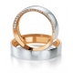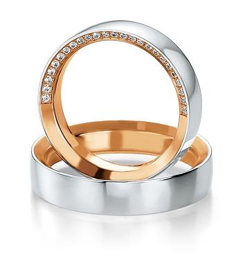 Ten dwukolorowy wzór o szerokości 5 mm z żółtego lub różowego złota z zewnętrznym pierścieniem z białego złota wygląda nadzwyczaj pięknie. Na uwagę zasługuje bardzo nietypowa i intrygująca oprawa brylantów o masie 0.163 na bocznej krawędzi obrączki. Biżuteria Breuning wyróżnia się perfekcyjną jakością wykonania. Białe złoto uzyskuje się przez dodatek palladu zamiast niklu, dzięki czemu obrączki są bezpieczne dla alergików. Pallad zapewnia również piękny śnieżno-biały kolor stopu, który dodatkowo wzmacnia rodowanie. Elementy z różnych kolorów złota są łączone metodą sienteringu , czyli spiekania w wysokiej temperaturze. Połączenia są zupełnie niewidoczne, nie ma żadnych przebarwień, które często pojawiają się w przypadku połączeń lutowanych. Technologia bezszwowa zapewnia obrączkom idealny kształt i dużą wytrzymałość, dzięki czemu można je w przyszłości powiększyć lub zmniejszyć. Powierzchnia biżuterii jest specjalnie utwardzana, żeby zwiększyć jej odporność na ścieranie.