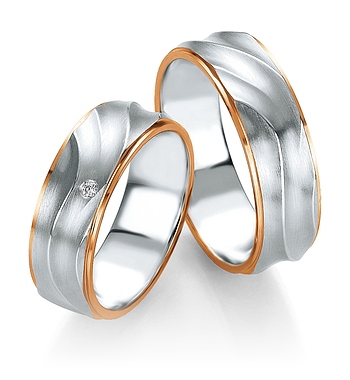 Wzór o interesującym kształcie wykonany jest z białego złota z żółtymi lub różowymi krawędziami. Obrączka damska ozdobiona pojedynczym brylantem o masie 0.02 ct, barwie H i czystości SI. Biżuteria ślubna Breuning - to najwyższa jakość i perfekcja wykonania. Białe złoto jest całkowicie pozbawione niklu. Biały kolor złota uzyskuje się przez dodatek palladu. Pallad jest metalem znacznie droższym, ale nie uczula i zapewnia piękny śnieżno-biały kolor stopu. Elementy z różnych kolorów złota są łączone metodą sienteringu , czyli spiekania w wysokiej temperaturze. Taka spoina jest niezwykle wytrzymała, niewidoczna i nie ma żadnych przebarwień, które pojawiają się w przypadku połączeń lutowanych. Technologia bezszwowa zapewnia obrączkom idealny kształt i dużą wytrzymałość. Obrączka nie ma łączenia na obwodzie i można ją w przyszłości powiększyć lub zmniejszyć. Powierzchnia jest specjalnie utwardzana.