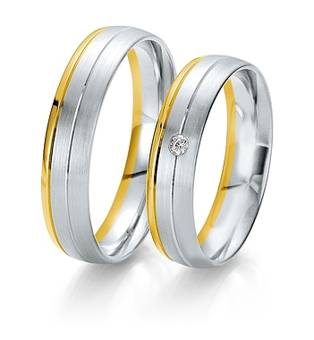 Najwyższej jakości trójkolorowe obrączki Breuning wykonane w technologii bezszwowej. W obrączce damskiej oprawiony brylant.