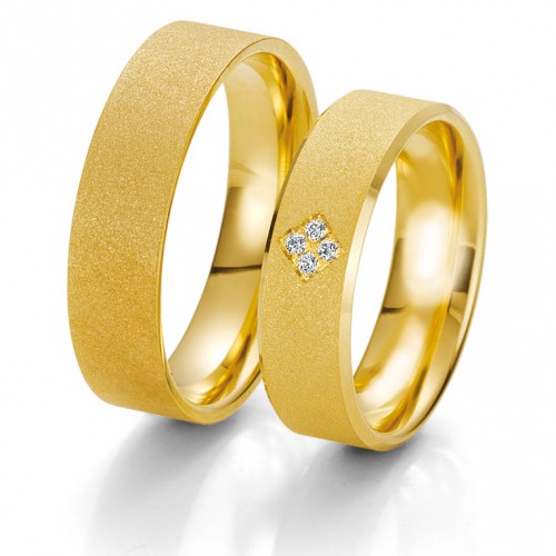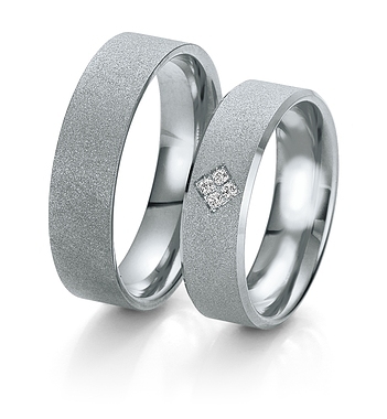 Najwyższej jakości obrączki Breuning wykonane w technologii bezszwowej. Powierzchnia matowa. W damskiej oprawione w kształcie rombu cztery brylanty.