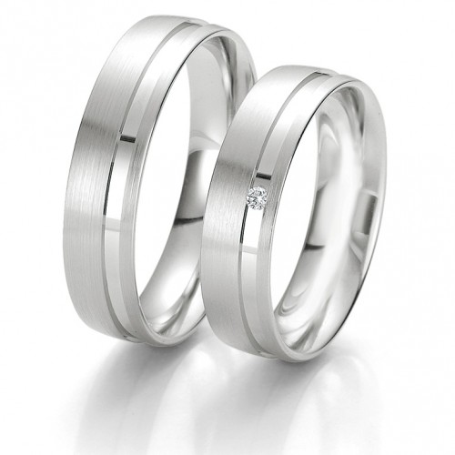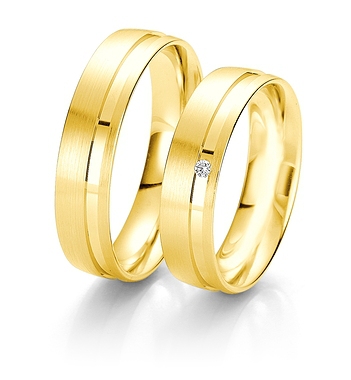 Najwyższej jakości jednokolorowe obrączki Breuning wykonane w technologii bezszwowej. W obrączce damskiej oprawiony brylant.