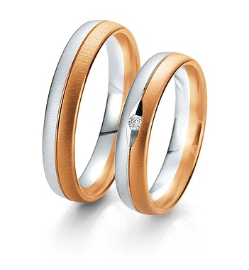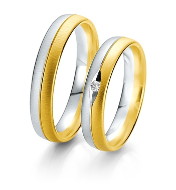 Najwyższej jakości dwukolorowe obrączki Breuning wykonane w technologii bezszwowej. W obrączce damskiej oprawiony brylant.