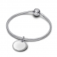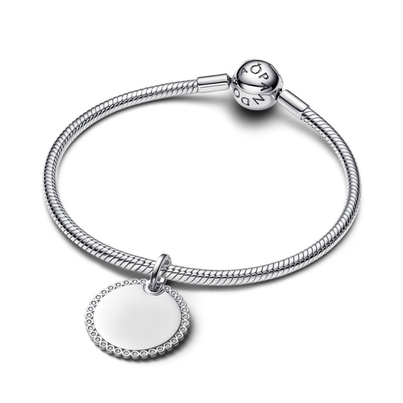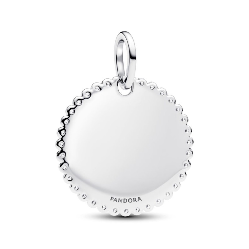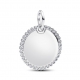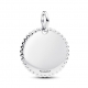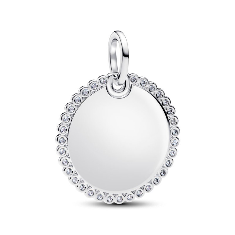Dodaj do swojej kolekcji srebrną zawieszkę w kształcie dysku obwiedzionego lśniącą mozaiką pavé z miejscem na grawer.