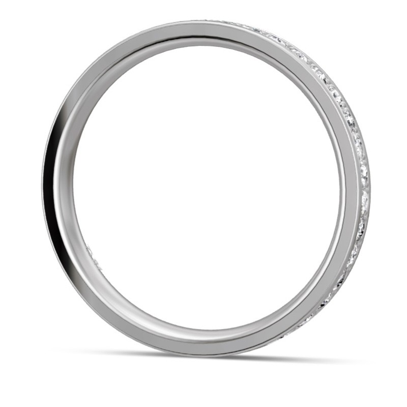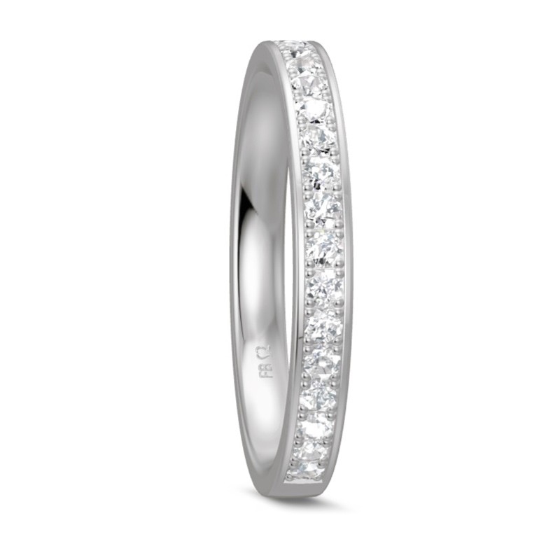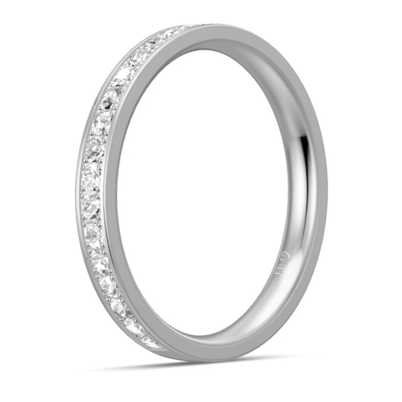 Pierścionek platynowy z brylantami o łącznej masie 0.40 ct czystości SI i barwie H - wzór Pt-5659. Klasyczny, elegancki w formie obrączki z oprawionymi na obwodzie diamentami. Doskonały do noszenia na jednym palcu z obrączką lub innym pierścionkiem. Identyczny wzór można zamówić z kamieniami o innej masie łącznej. Jest też możliwość wykonania tego modelu z białego lub żółtego złota. Do wykonania pierścionka użyto najwyższej jakości stopu platyny próby 950. To praktycznie czysta platyna, gdyż jej zawartość w stopie wynosi 95%. Biżuteria platynowa charakteryzuje się piękną srebrzystą barwą i niezwykłą trwałością. Wyroby jubilerskie z platyny dają się pięknie polerować i są znacznie twardsze niż wykonane z białego złota. Powierzchnia mniej się rysuje i pierścionek po wielu latach noszenia zachowuje swój pierwotny wygląd.
