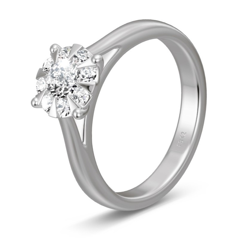 Pierścionek platynowy z brylantami o łącznej masie 0.53 ct o czystości SI i barwie H - wzór Pt-5766. Piękny pierścionek z platyny z ciekawą wielokamieniową oprawą. Kompozycja kamieni tworzy złudzenie jednego dużego brylantu i daje efekt kamienia 1.5 ct. Identyczny wzór można zamówić w tańszej wersji z diamentami o mniejszej masie. Jest też możliwość wykonania tego modelu z białego lub żółtego złota. Do wykonania pierścionka użyto najwyższej jakości stopu platyny próby 950. To praktycznie czysta platyna, gdyż jej zawartość w stopie wynosi 95%. Biżuteria platynowa charakteryzuje się piękną srebrzystą barwą i niezwykłą trwałością. Wyroby jubilerskie z platyny dają się pięknie polerować i są znacznie twardsze niż wykonane z białego złota. Powierzchnia mniej się rysuje i pierścionek po wielu latach noszenia zachowuje swój pierwotny wygląd.