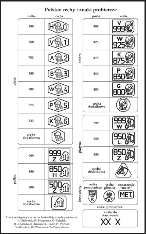 Litera po lewej stronie znaku probierczego określa w którym urzędzie przybito próbę. Cyfra po prawej określa zawartość czystego kruszcu w stopie.