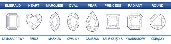- Kształt: kombinacja zarysu diamentu z rozmieszczeniem faset.
