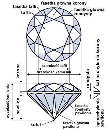 Pełny, klasyczny szlif brylantowy zawiera nie mniej niż 58 faset: 33 w koronie i 25 w podstawie.